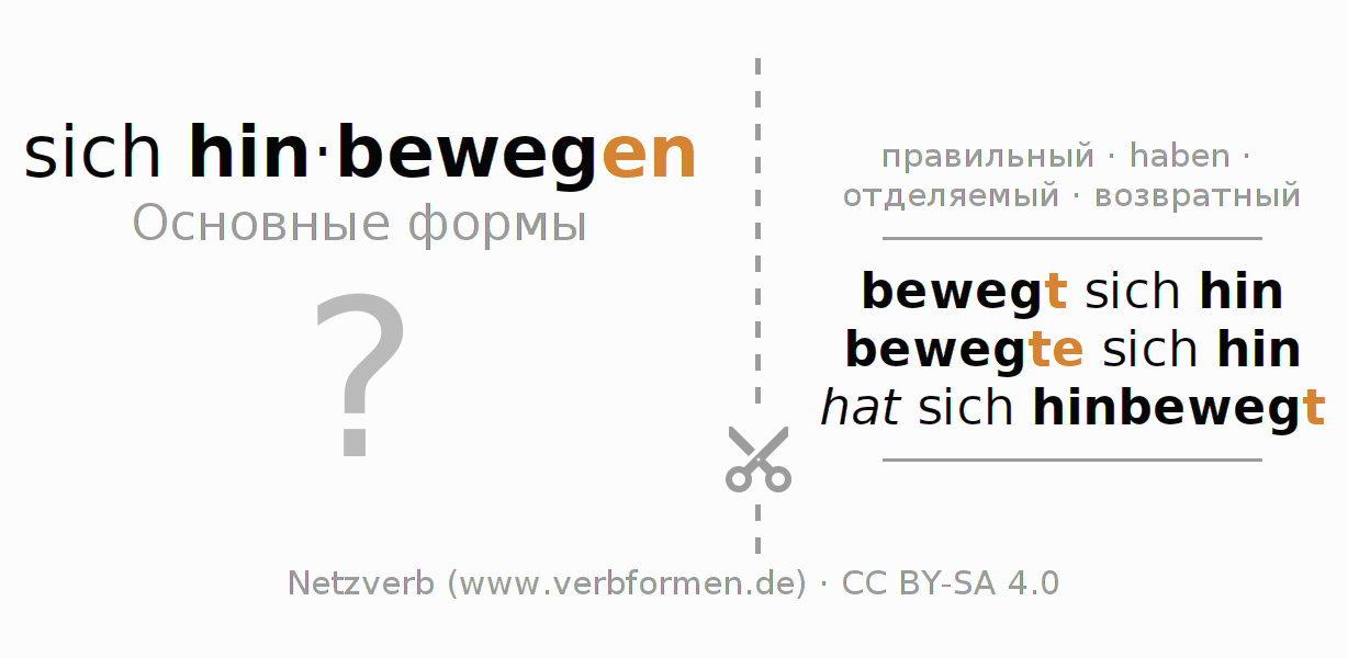 С обучающими карточками можно по отдельности изучать и тренировать спряжения немецких глаголов. Для этого на учебных листах, формы глагола hinbewegen стоит обрабатывать по порядку. Необходимые формы глагола должны быть представлены в голове. Затем они сверяются с подсказками на карточках. При правильном ответе подтверждается ваш прогресс в обучении. Если есть ошибки, можно использовать подсказки для запоминания неизвестных форм. Но лучше всего распечатать PDF фаил с обучающими карточками и сложить их как было указано. Таким образом их можно использовать в стопке с другими глаголами для обучения. Еще есть множество других рабочих листов с глаголами hinbewegen. Все материалы доступны в виде Открытых образовательных ресурсов(ООР) в рамках лицензии CC BY-SA 4.0 бесплатны и могут быть свободно использованы.