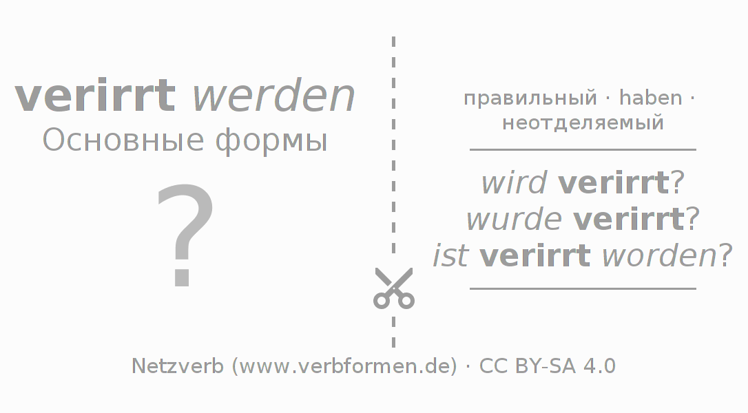 С обучающими карточками можно по отдельности изучать и тренировать спряжения немецких глаголов. Для этого на учебных листах, формы глагола verirren стоит обрабатывать по порядку. Необходимые формы глагола должны быть представлены в голове. Затем они сверяются с подсказками на карточках. При правильном ответе подтверждается ваш прогресс в обучении. Если есть ошибки, можно использовать подсказки для запоминания неизвестных форм. Но лучше всего распечатать PDF фаил с обучающими карточками и сложить их как было указано. Таким образом их можно использовать в стопке с другими глаголами для обучения. Еще есть множество других рабочих листов с глаголами verirren. Все материалы доступны в виде Открытых образовательных ресурсов(ООР) в рамках лицензии CC BY-SA 4.0 бесплатны и могут быть свободно использованы.
