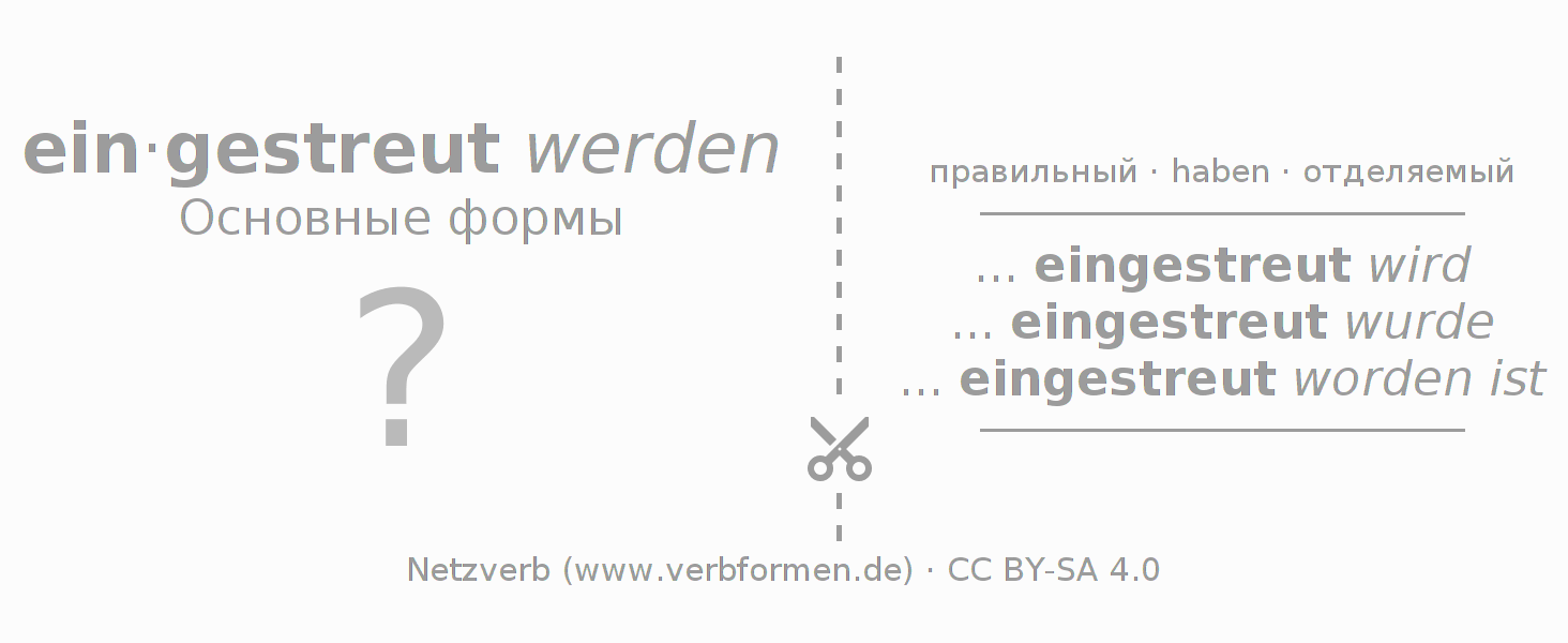 С обучающими карточками можно по отдельности изучать и тренировать спряжения немецких глаголов. Для этого на учебных листах, формы глагола einstreuen стоит обрабатывать по порядку. Необходимые формы глагола должны быть представлены в голове. Затем они сверяются с подсказками на карточках. При правильном ответе подтверждается ваш прогресс в обучении. Если есть ошибки, можно использовать подсказки для запоминания неизвестных форм. Но лучше всего распечатать PDF фаил с обучающими карточками и сложить их как было указано. Таким образом их можно использовать в стопке с другими глаголами для обучения. Еще есть множество других рабочих листов с глаголами einstreuen. Все материалы доступны в виде Открытых образовательных ресурсов(ООР) в рамках лицензии CC BY-SA 4.0 бесплатны и могут быть свободно использованы.