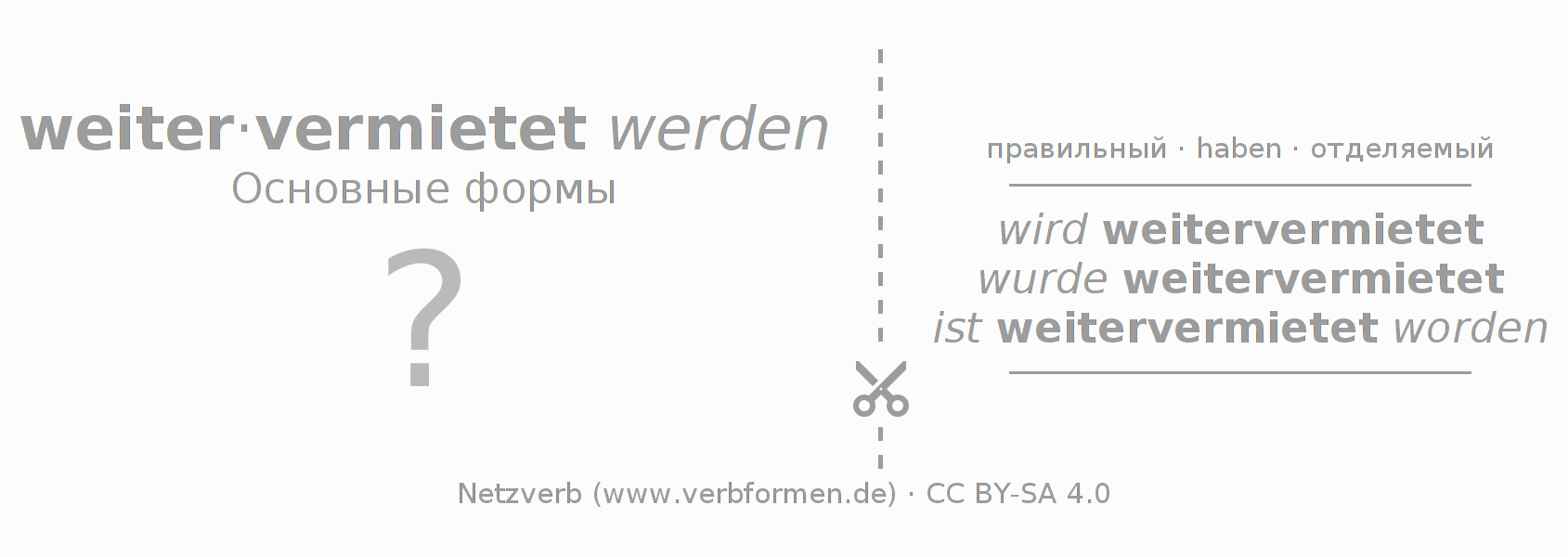 С обучающими карточками можно по отдельности изучать и тренировать спряжения немецких глаголов. Для этого на учебных листах, формы глагола weitervermieten стоит обрабатывать по порядку. Необходимые формы глагола должны быть представлены в голове. Затем они сверяются с подсказками на карточках. При правильном ответе подтверждается ваш прогресс в обучении. Если есть ошибки, можно использовать подсказки для запоминания неизвестных форм. Но лучше всего распечатать PDF фаил с обучающими карточками и сложить их как было указано. Таким образом их можно использовать в стопке с другими глаголами для обучения. Еще есть множество других рабочих листов с глаголами weitervermieten. Все материалы доступны в виде Открытых образовательных ресурсов(ООР) в рамках лицензии CC BY-SA 4.0 бесплатны и могут быть свободно использованы.
