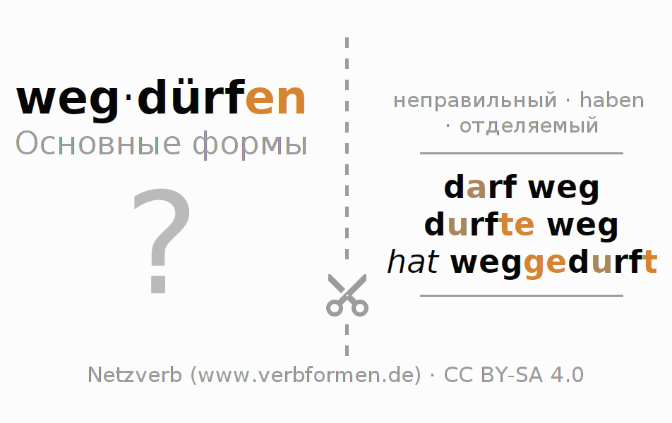 С обучающими карточками можно по отдельности изучать и тренировать спряжения немецких глаголов. Для этого на учебных листах, формы глагола wegdürfen стоит обрабатывать по порядку. Необходимые формы глагола должны быть представлены в голове. Затем они сверяются с подсказками на карточках. При правильном ответе подтверждается ваш прогресс в обучении. Если есть ошибки, можно использовать подсказки для запоминания неизвестных форм. Но лучше всего распечатать PDF фаил с обучающими карточками и сложить их как было указано. Таким образом их можно использовать в стопке с другими глаголами для обучения. Еще есть множество других рабочих листов с глаголами wegdürfen. Все материалы доступны в виде Открытых образовательных ресурсов(ООР) в рамках лицензии CC BY-SA 4.0 бесплатны и могут быть свободно использованы.