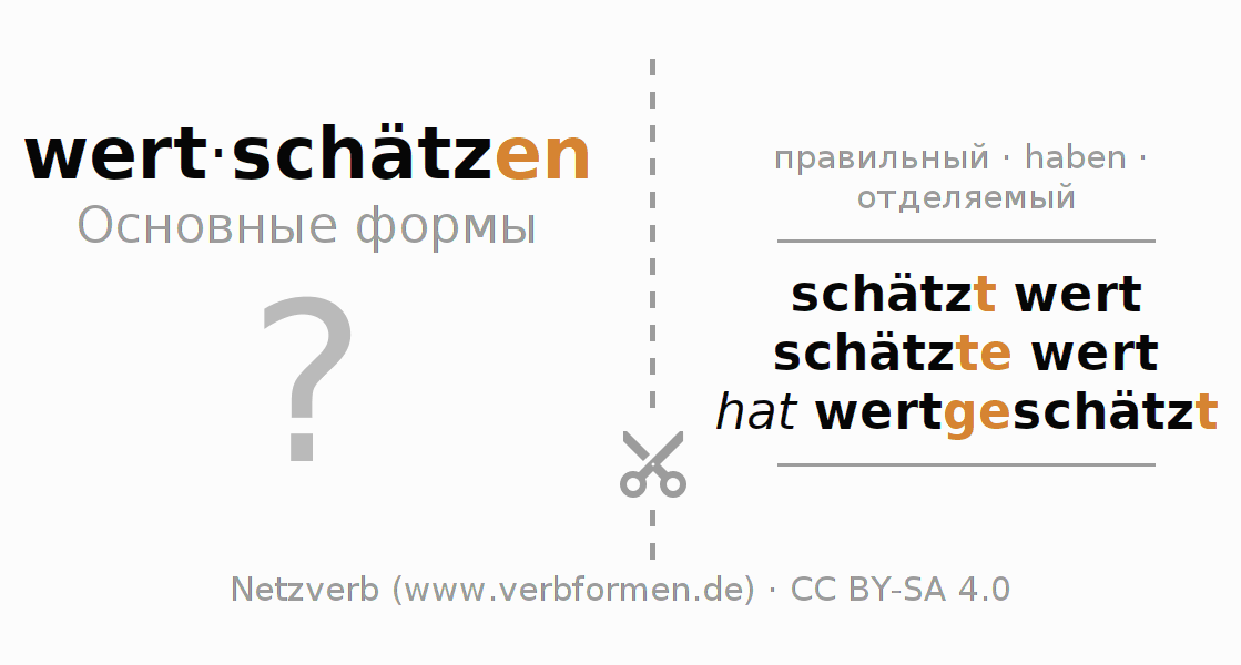 С обучающими карточками можно по отдельности изучать и тренировать спряжения немецких глаголов. Для этого на учебных листах, формы глагола wertschätzen стоит обрабатывать по порядку. Необходимые формы глагола должны быть представлены в голове. Затем они сверяются с подсказками на карточках. При правильном ответе подтверждается ваш прогресс в обучении. Если есть ошибки, можно использовать подсказки для запоминания неизвестных форм. Но лучше всего распечатать PDF фаил с обучающими карточками и сложить их как было указано. Таким образом их можно использовать в стопке с другими глаголами для обучения. Еще есть множество других рабочих листов с глаголами wertschätzen. Все материалы доступны в виде Открытых образовательных ресурсов(ООР) в рамках лицензии CC BY-SA 4.0 бесплатны и могут быть свободно использованы.