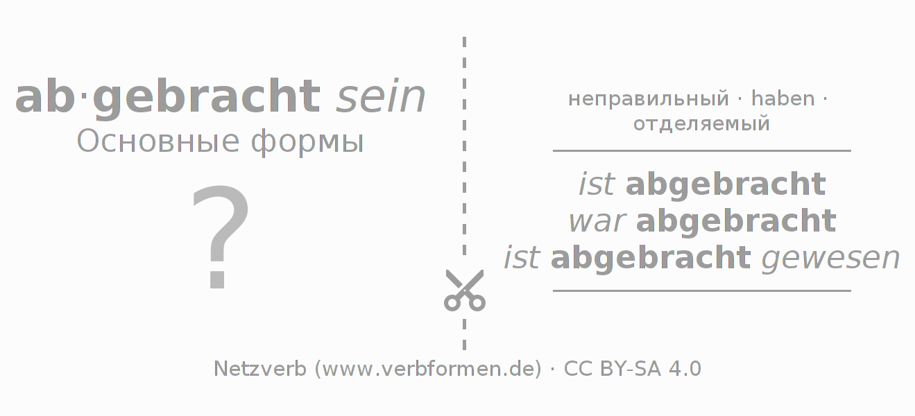 С обучающими карточками можно по отдельности изучать и тренировать спряжения немецких глаголов. Для этого на учебных листах, формы глагола abbringen стоит обрабатывать по порядку. Необходимые формы глагола должны быть представлены в голове. Затем они сверяются с подсказками на карточках. При правильном ответе подтверждается ваш прогресс в обучении. Если есть ошибки, можно использовать подсказки для запоминания неизвестных форм. Но лучше всего распечатать PDF фаил с обучающими карточками и сложить их как было указано. Таким образом их можно использовать в стопке с другими глаголами для обучения. Еще есть множество других рабочих листов с глаголами abbringen. Все материалы доступны в виде Открытых образовательных ресурсов(ООР) в рамках лицензии CC BY-SA 4.0 бесплатны и могут быть свободно использованы.