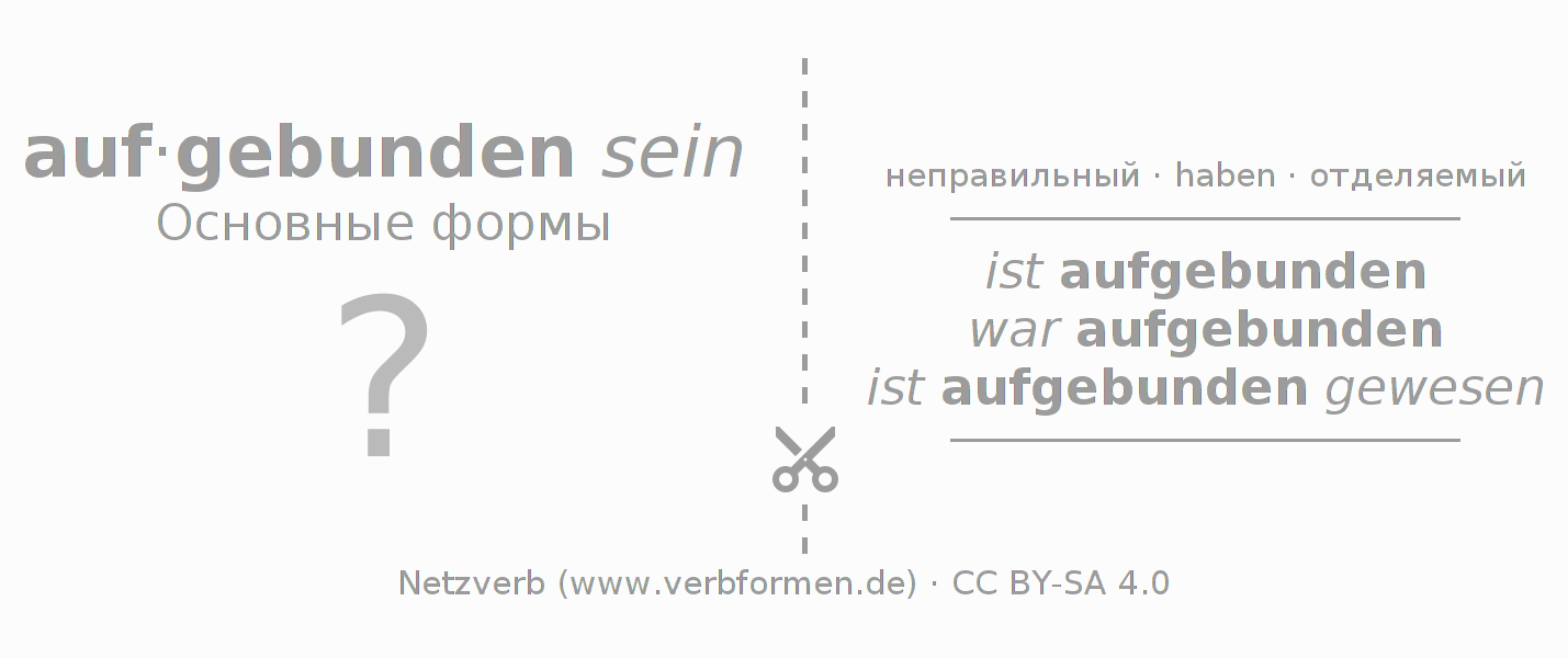 С обучающими карточками можно по отдельности изучать и тренировать спряжения немецких глаголов. Для этого на учебных листах, формы глагола aufbinden стоит обрабатывать по порядку. Необходимые формы глагола должны быть представлены в голове. Затем они сверяются с подсказками на карточках. При правильном ответе подтверждается ваш прогресс в обучении. Если есть ошибки, можно использовать подсказки для запоминания неизвестных форм. Но лучше всего распечатать PDF фаил с обучающими карточками и сложить их как было указано. Таким образом их можно использовать в стопке с другими глаголами для обучения. Еще есть множество других рабочих листов с глаголами aufbinden. Все материалы доступны в виде Открытых образовательных ресурсов(ООР) в рамках лицензии CC BY-SA 4.0 бесплатны и могут быть свободно использованы.