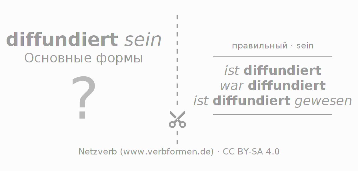 С обучающими карточками можно по отдельности изучать и тренировать спряжения немецких глаголов. Для этого на учебных листах, формы глагола diffundieren стоит обрабатывать по порядку. Необходимые формы глагола должны быть представлены в голове. Затем они сверяются с подсказками на карточках. При правильном ответе подтверждается ваш прогресс в обучении. Если есть ошибки, можно использовать подсказки для запоминания неизвестных форм. Но лучше всего распечатать PDF фаил с обучающими карточками и сложить их как было указано. Таким образом их можно использовать в стопке с другими глаголами для обучения. Еще есть множество других рабочих листов с глаголами diffundieren. Все материалы доступны в виде Открытых образовательных ресурсов(ООР) в рамках лицензии CC BY-SA 4.0 бесплатны и могут быть свободно использованы.