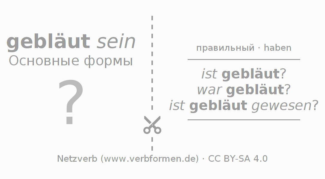 С обучающими карточками можно по отдельности изучать и тренировать спряжения немецких глаголов. Для этого на учебных листах, формы глагола bläuen стоит обрабатывать по порядку. Необходимые формы глагола должны быть представлены в голове. Затем они сверяются с подсказками на карточках. При правильном ответе подтверждается ваш прогресс в обучении. Если есть ошибки, можно использовать подсказки для запоминания неизвестных форм. Но лучше всего распечатать PDF фаил с обучающими карточками и сложить их как было указано. Таким образом их можно использовать в стопке с другими глаголами для обучения. Еще есть множество других рабочих листов с глаголами bläuen. Все материалы доступны в виде Открытых образовательных ресурсов(ООР) в рамках лицензии CC BY-SA 4.0 бесплатны и могут быть свободно использованы.