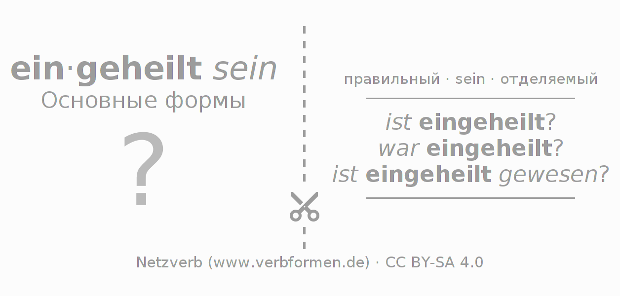 С обучающими карточками можно по отдельности изучать и тренировать спряжения немецких глаголов. Для этого на учебных листах, формы глагола einheilen стоит обрабатывать по порядку. Необходимые формы глагола должны быть представлены в голове. Затем они сверяются с подсказками на карточках. При правильном ответе подтверждается ваш прогресс в обучении. Если есть ошибки, можно использовать подсказки для запоминания неизвестных форм. Но лучше всего распечатать PDF фаил с обучающими карточками и сложить их как было указано. Таким образом их можно использовать в стопке с другими глаголами для обучения. Еще есть множество других рабочих листов с глаголами einheilen. Все материалы доступны в виде Открытых образовательных ресурсов(ООР) в рамках лицензии CC BY-SA 4.0 бесплатны и могут быть свободно использованы.