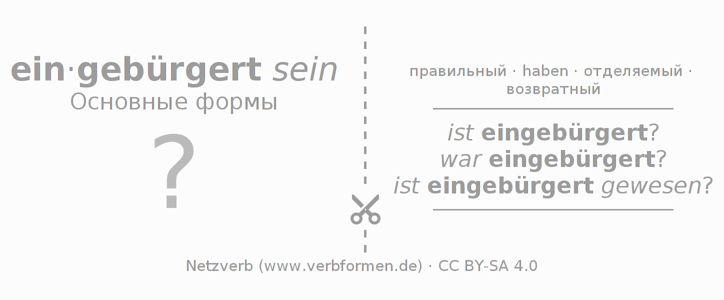 С обучающими карточками можно по отдельности изучать и тренировать спряжения немецких глаголов. Для этого на учебных листах, формы глагола einbürgern стоит обрабатывать по порядку. Необходимые формы глагола должны быть представлены в голове. Затем они сверяются с подсказками на карточках. При правильном ответе подтверждается ваш прогресс в обучении. Если есть ошибки, можно использовать подсказки для запоминания неизвестных форм. Но лучше всего распечатать PDF фаил с обучающими карточками и сложить их как было указано. Таким образом их можно использовать в стопке с другими глаголами для обучения. Еще есть множество других рабочих листов с глаголами einbürgern. Все материалы доступны в виде Открытых образовательных ресурсов(ООР) в рамках лицензии CC BY-SA 4.0 бесплатны и могут быть свободно использованы.