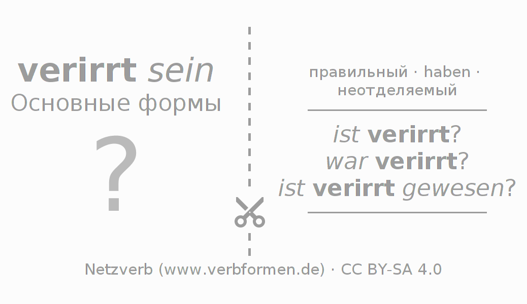 С обучающими карточками можно по отдельности изучать и тренировать спряжения немецких глаголов. Для этого на учебных листах, формы глагола verirren стоит обрабатывать по порядку. Необходимые формы глагола должны быть представлены в голове. Затем они сверяются с подсказками на карточках. При правильном ответе подтверждается ваш прогресс в обучении. Если есть ошибки, можно использовать подсказки для запоминания неизвестных форм. Но лучше всего распечатать PDF фаил с обучающими карточками и сложить их как было указано. Таким образом их можно использовать в стопке с другими глаголами для обучения. Еще есть множество других рабочих листов с глаголами verirren. Все материалы доступны в виде Открытых образовательных ресурсов(ООР) в рамках лицензии CC BY-SA 4.0 бесплатны и могут быть свободно использованы.