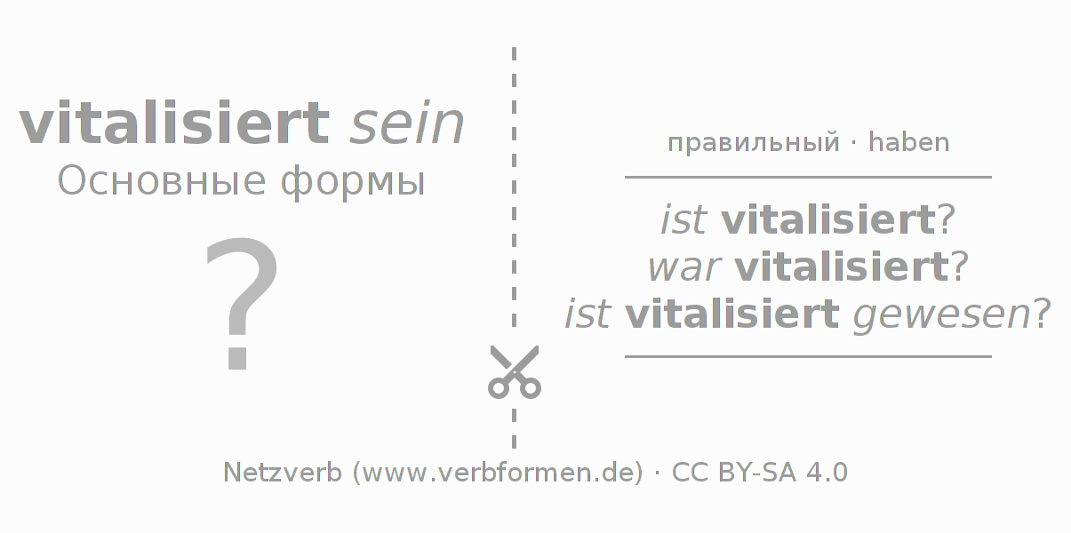 С обучающими карточками можно по отдельности изучать и тренировать спряжения немецких глаголов. Для этого на учебных листах, формы глагола vitalisieren стоит обрабатывать по порядку. Необходимые формы глагола должны быть представлены в голове. Затем они сверяются с подсказками на карточках. При правильном ответе подтверждается ваш прогресс в обучении. Если есть ошибки, можно использовать подсказки для запоминания неизвестных форм. Но лучше всего распечатать PDF фаил с обучающими карточками и сложить их как было указано. Таким образом их можно использовать в стопке с другими глаголами для обучения. Еще есть множество других рабочих листов с глаголами vitalisieren. Все материалы доступны в виде Открытых образовательных ресурсов(ООР) в рамках лицензии CC BY-SA 4.0 бесплатны и могут быть свободно использованы.