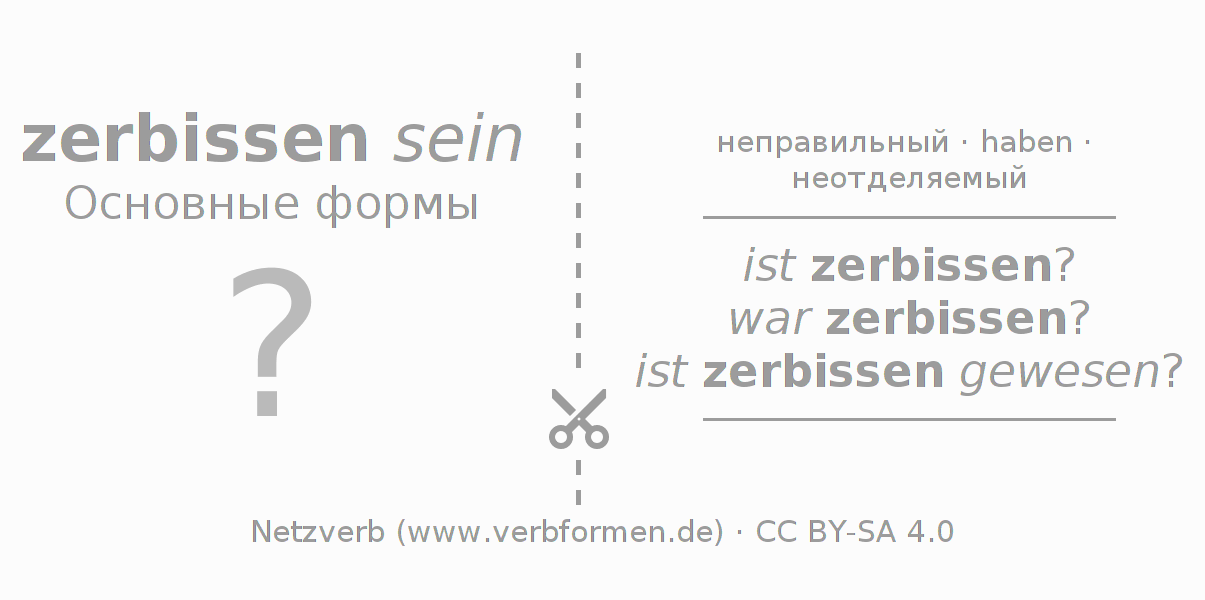 С обучающими карточками можно по отдельности изучать и тренировать спряжения немецких глаголов. Для этого на учебных листах, формы глагола zerbeißen стоит обрабатывать по порядку. Необходимые формы глагола должны быть представлены в голове. Затем они сверяются с подсказками на карточках. При правильном ответе подтверждается ваш прогресс в обучении. Если есть ошибки, можно использовать подсказки для запоминания неизвестных форм. Но лучше всего распечатать PDF фаил с обучающими карточками и сложить их как было указано. Таким образом их можно использовать в стопке с другими глаголами для обучения. Еще есть множество других рабочих листов с глаголами zerbeißen. Все материалы доступны в виде Открытых образовательных ресурсов(ООР) в рамках лицензии CC BY-SA 4.0 бесплатны и могут быть свободно использованы.