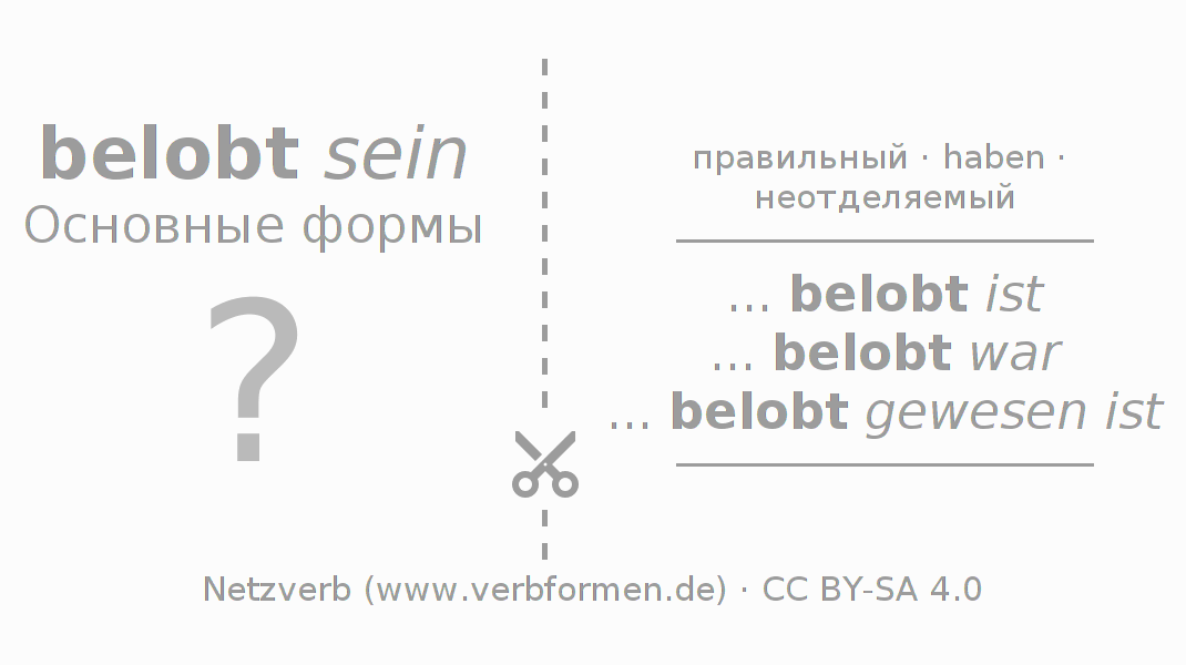 С обучающими карточками можно по отдельности изучать и тренировать спряжения немецких глаголов. Для этого на учебных листах, формы глагола beloben стоит обрабатывать по порядку. Необходимые формы глагола должны быть представлены в голове. Затем они сверяются с подсказками на карточках. При правильном ответе подтверждается ваш прогресс в обучении. Если есть ошибки, можно использовать подсказки для запоминания неизвестных форм. Но лучше всего распечатать PDF фаил с обучающими карточками и сложить их как было указано. Таким образом их можно использовать в стопке с другими глаголами для обучения. Еще есть множество других рабочих листов с глаголами beloben. Все материалы доступны в виде Открытых образовательных ресурсов(ООР) в рамках лицензии CC BY-SA 4.0 бесплатны и могут быть свободно использованы.