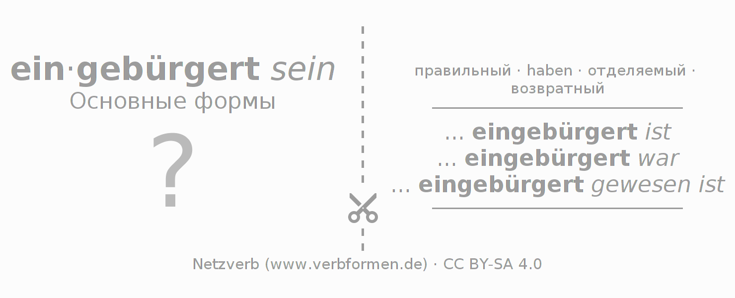 С обучающими карточками можно по отдельности изучать и тренировать спряжения немецких глаголов. Для этого на учебных листах, формы глагола einbürgern стоит обрабатывать по порядку. Необходимые формы глагола должны быть представлены в голове. Затем они сверяются с подсказками на карточках. При правильном ответе подтверждается ваш прогресс в обучении. Если есть ошибки, можно использовать подсказки для запоминания неизвестных форм. Но лучше всего распечатать PDF фаил с обучающими карточками и сложить их как было указано. Таким образом их можно использовать в стопке с другими глаголами для обучения. Еще есть множество других рабочих листов с глаголами einbürgern. Все материалы доступны в виде Открытых образовательных ресурсов(ООР) в рамках лицензии CC BY-SA 4.0 бесплатны и могут быть свободно использованы.