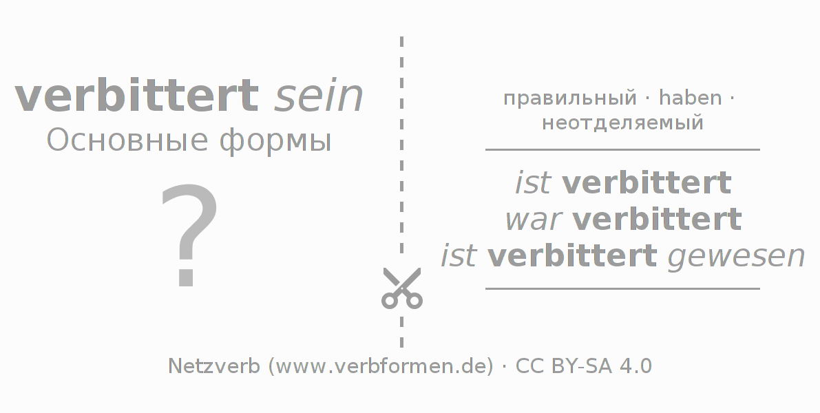 С обучающими карточками можно по отдельности изучать и тренировать спряжения немецких глаголов. Для этого на учебных листах, формы глагола verbittern стоит обрабатывать по порядку. Необходимые формы глагола должны быть представлены в голове. Затем они сверяются с подсказками на карточках. При правильном ответе подтверждается ваш прогресс в обучении. Если есть ошибки, можно использовать подсказки для запоминания неизвестных форм. Но лучше всего распечатать PDF фаил с обучающими карточками и сложить их как было указано. Таким образом их можно использовать в стопке с другими глаголами для обучения. Еще есть множество других рабочих листов с глаголами verbittern. Все материалы доступны в виде Открытых образовательных ресурсов(ООР) в рамках лицензии CC BY-SA 4.0 бесплатны и могут быть свободно использованы.