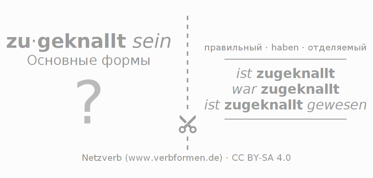 С обучающими карточками можно по отдельности изучать и тренировать спряжения немецких глаголов. Для этого на учебных листах, формы глагола zuknallen стоит обрабатывать по порядку. Необходимые формы глагола должны быть представлены в голове. Затем они сверяются с подсказками на карточках. При правильном ответе подтверждается ваш прогресс в обучении. Если есть ошибки, можно использовать подсказки для запоминания неизвестных форм. Но лучше всего распечатать PDF фаил с обучающими карточками и сложить их как было указано. Таким образом их можно использовать в стопке с другими глаголами для обучения. Еще есть множество других рабочих листов с глаголами zuknallen. Все материалы доступны в виде Открытых образовательных ресурсов(ООР) в рамках лицензии CC BY-SA 4.0 бесплатны и могут быть свободно использованы.