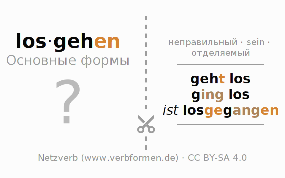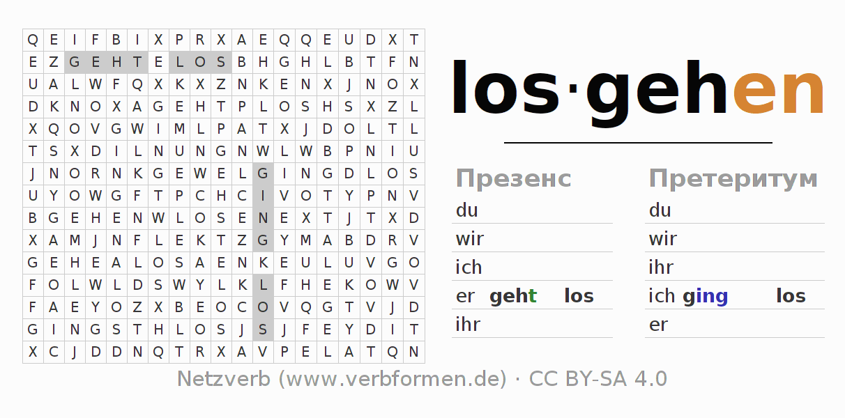 Рабочие материалы служат обучением спряжениям глагола losgehen на уроке и при самообучении. Рабочие материалы могут быть свободно использованы в рамках лицензии CC BY-SA 4.0 в виде Открытых образовательных ресурсов(ООР) например могут быть бесплатно использованы на уроке. Для этого имеется много различных типов рабочих материалов для глагола losgehen в наличии. Это таблицы спряжений, головоломки и игры. Весь учебный материал доступен бесплатно как файлы PDF, в виде изображений или как интерактивная версия браузера. В дополнение к задачам, имеются бесчисленные примеры для losgehen а также помощь в использовании глаголов.