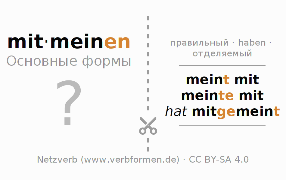 Глагольные таблицы, содержащие все формы глагола mitmeinen, для наглядности объединены в одну общую таблицу.