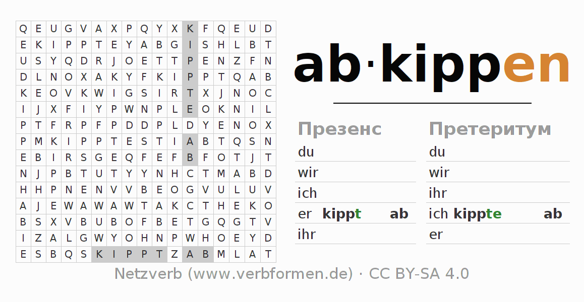 С помощью этих головоломок по поиску слов Вы можете подходящим для Вас способом изучать спряжение немецкого глагола abkippen.