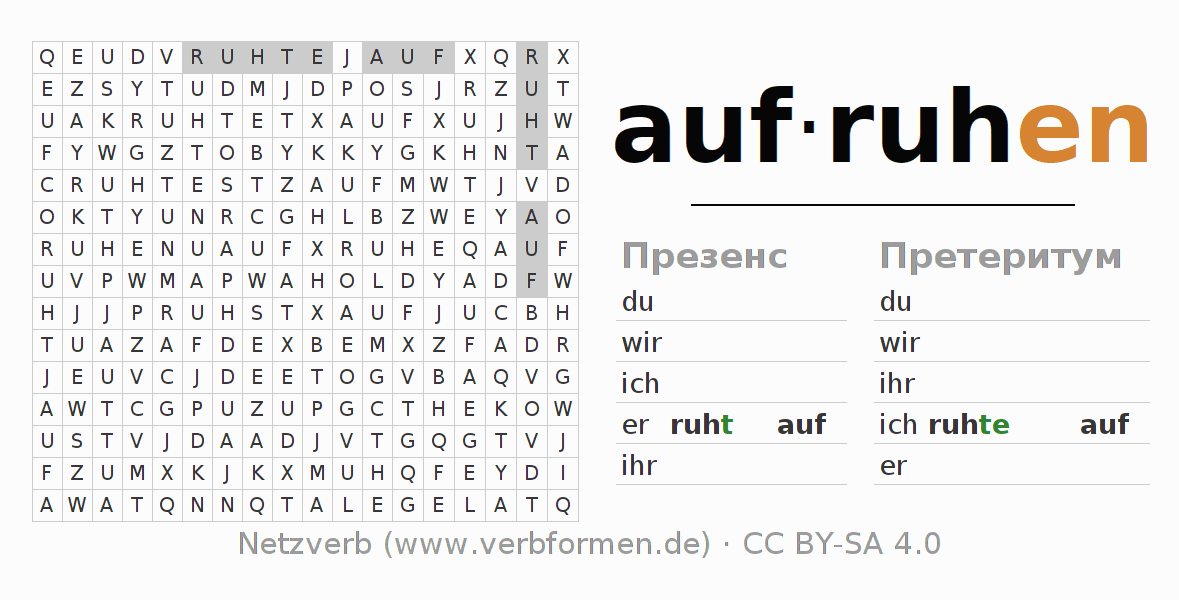 Рабочие материалы служат обучением спряжениям глагола aufruhen на уроке и при самообучении. Рабочие материалы могут быть свободно использованы в рамках лицензии CC BY-SA 4.0 в виде Открытых образовательных ресурсов(ООР) например могут быть бесплатно использованы на уроке. Для этого имеется много различных типов рабочих материалов для глагола aufruhen в наличии. Это таблицы спряжений, головоломки и игры. Весь учебный материал доступен бесплатно как файлы PDF, в виде изображений или как интерактивная версия браузера. В дополнение к задачам, имеются бесчисленные примеры для aufruhen а также помощь в использовании глаголов.