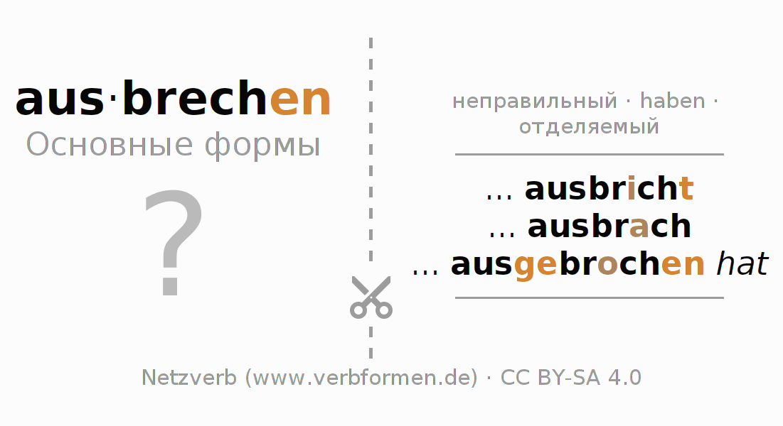 Глагольные таблицы, содержащие все формы глагола ausbrechen, для наглядности объединены в одну общую таблицу.