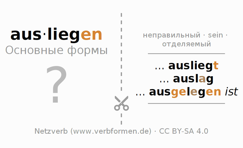 С помощью обучающих карточек можно эффективно и удобно изучать и запоминать глагольные формы ausliegen. Обучающие карточки можно распечатать в формате PDF и вырезать.