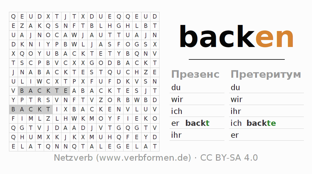 Рабочие материалы служат обучением спряжениям глагола backen на уроке и при самообучении. Рабочие материалы могут быть свободно использованы в рамках лицензии CC BY-SA 4.0 в виде Открытых образовательных ресурсов(ООР) например могут быть бесплатно использованы на уроке. Для этого имеется много различных типов рабочих материалов для глагола backen (regelm) в наличии. Это таблицы спряжений, головоломки и игры. Весь учебный материал доступен бесплатно как файлы PDF, в виде изображений или как интерактивная версия браузера. В дополнение к задачам, имеются бесчисленные примеры для backen а также помощь в использовании глаголов.