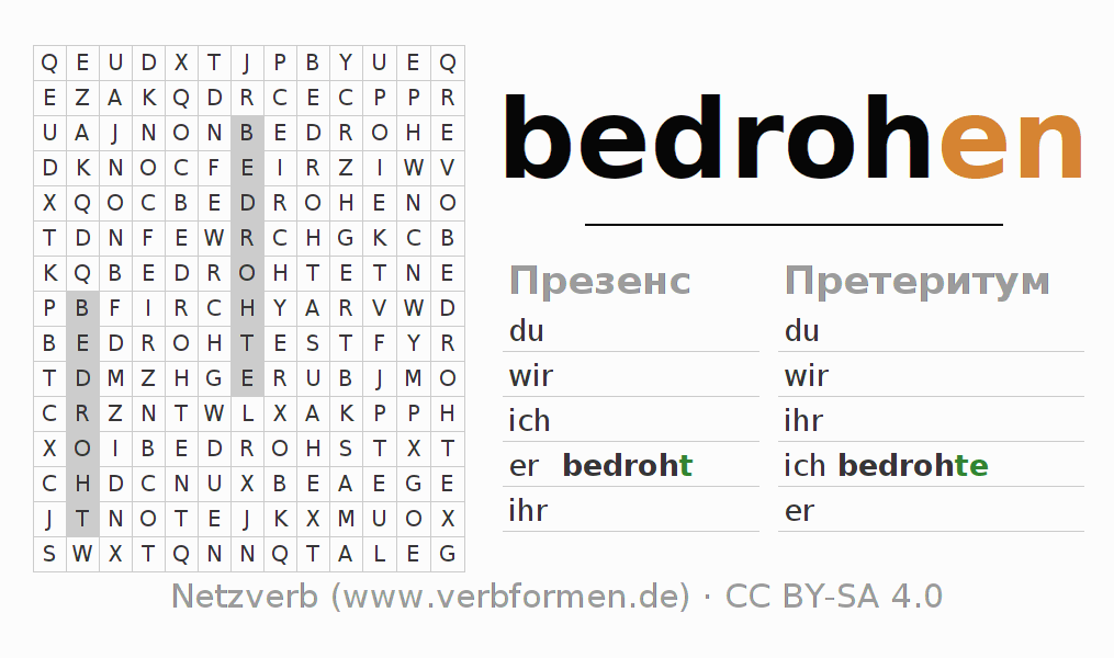 Рабочие материалы служат обучением спряжениям глагола bedrohen на уроке и при самообучении. Рабочие материалы могут быть свободно использованы в рамках лицензии CC BY-SA 4.0 в виде Открытых образовательных ресурсов(ООР) например могут быть бесплатно использованы на уроке. Для этого имеется много различных типов рабочих материалов для глагола bedrohen в наличии. Это таблицы спряжений, головоломки и игры. Весь учебный материал доступен бесплатно как файлы PDF, в виде изображений или как интерактивная версия браузера. В дополнение к задачам, имеются бесчисленные примеры для bedrohen а также помощь в использовании глаголов.