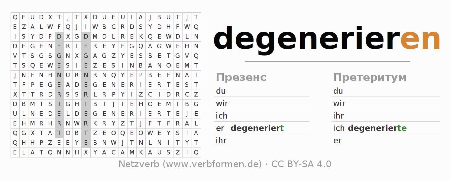 С помощью этих головоломок по поиску слов Вы можете подходящим для Вас способом изучать спряжение немецкого глагола degenerieren.