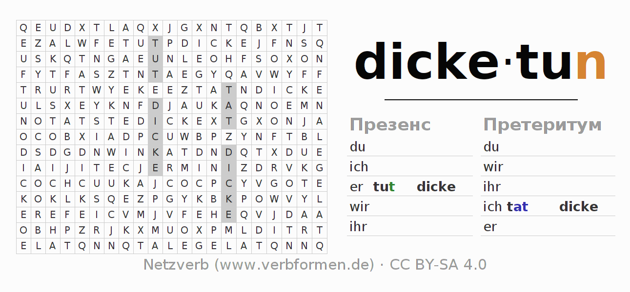 С помощью этих головоломок по поиску слов Вы можете подходящим для Вас способом изучать спряжение немецкого глагола dicketun.
