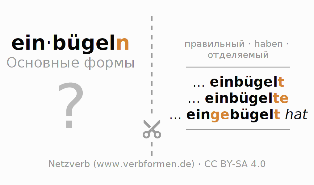 Глагольные таблицы, содержащие все формы глагола einbügeln, для наглядности объединены в одну общую таблицу.