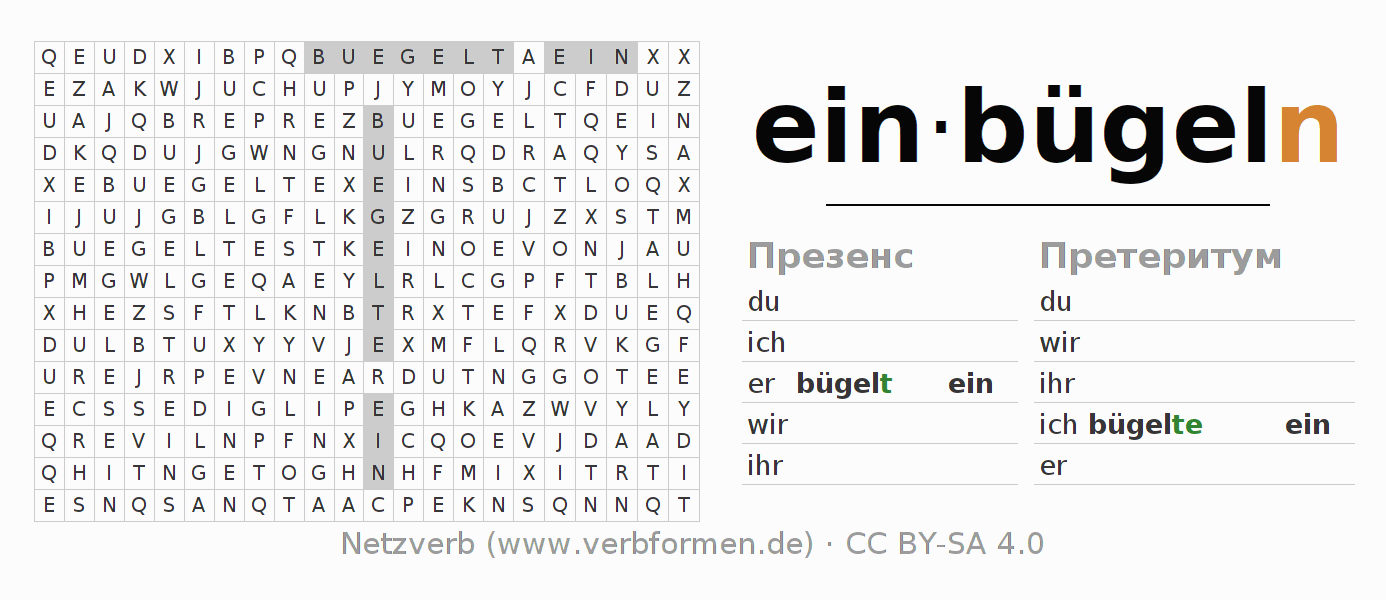 С помощью этих головоломок по поиску слов Вы можете подходящим для Вас способом изучать спряжение немецкого глагола einbügeln.