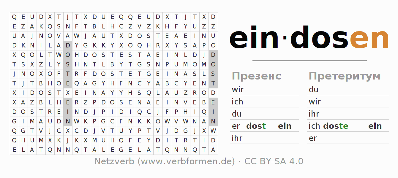 С помощью этих головоломок по поиску слов Вы можете подходящим для Вас способом изучать спряжение немецкого глагола eindosen.