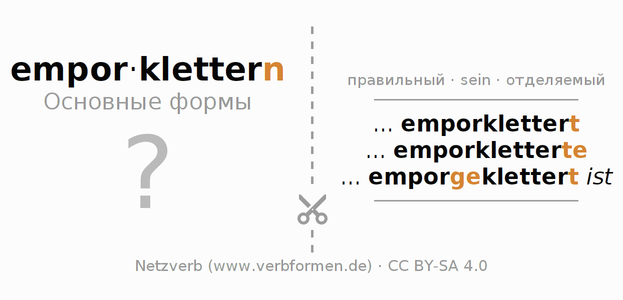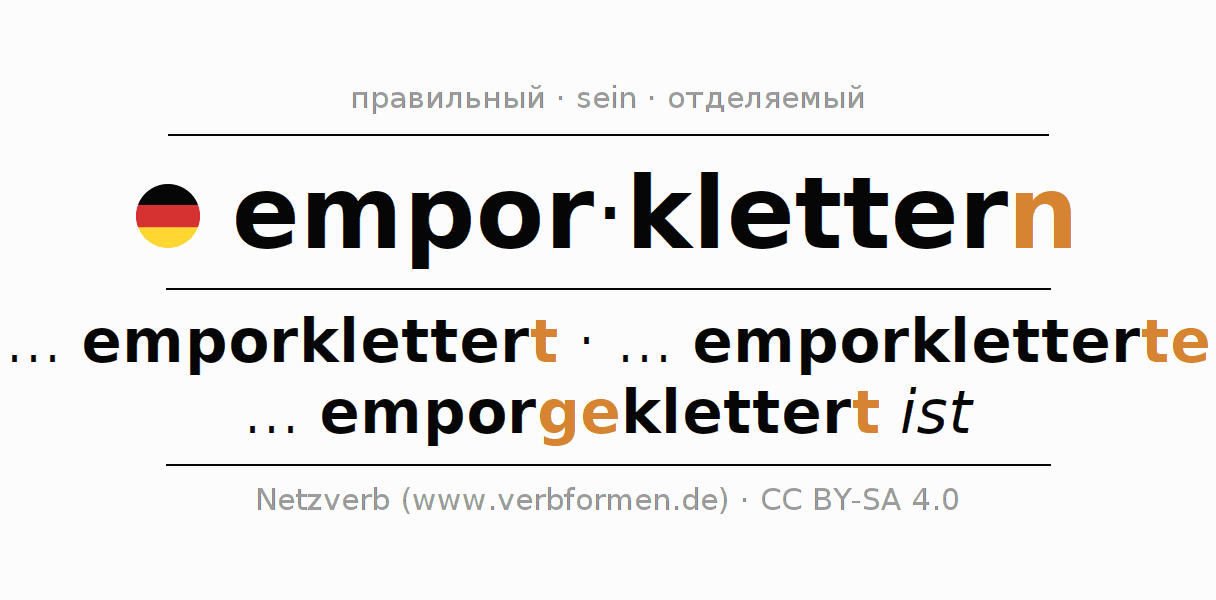 Глагольные таблицы, содержащие все формы глагола emporklettern, для наглядности объединены в одну общую таблицу.