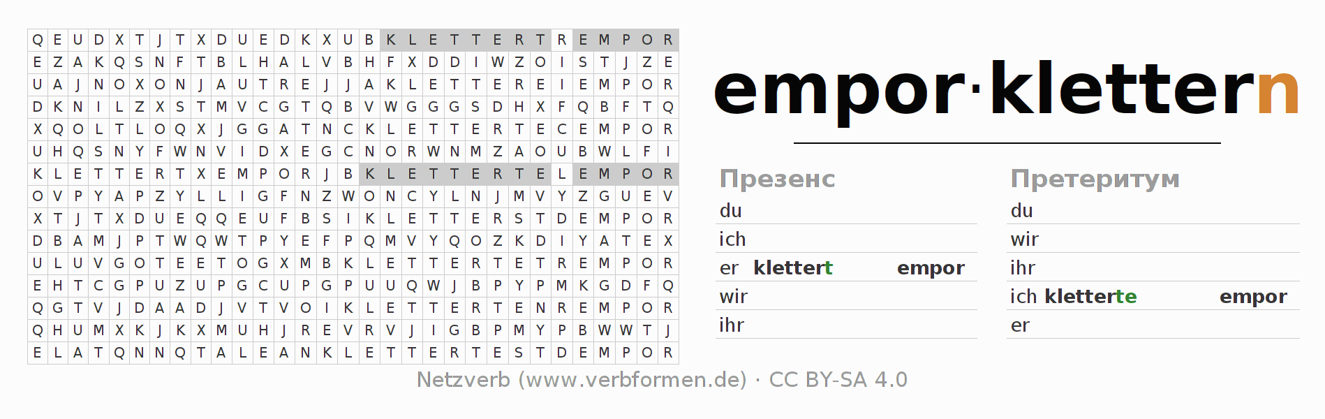 Рабочие материалы служат обучением спряжениям глагола emporklettern на уроке и при самообучении. Рабочие материалы могут быть свободно использованы в рамках лицензии CC BY-SA 4.0 в виде Открытых образовательных ресурсов(ООР) например могут быть бесплатно использованы на уроке. Для этого имеется много различных типов рабочих материалов для глагола emporklettern в наличии. Это таблицы спряжений, головоломки и игры. Весь учебный материал доступен бесплатно как файлы PDF, в виде изображений или как интерактивная версия браузера. В дополнение к задачам, имеются бесчисленные примеры для emporklettern а также помощь в использовании глаголов.