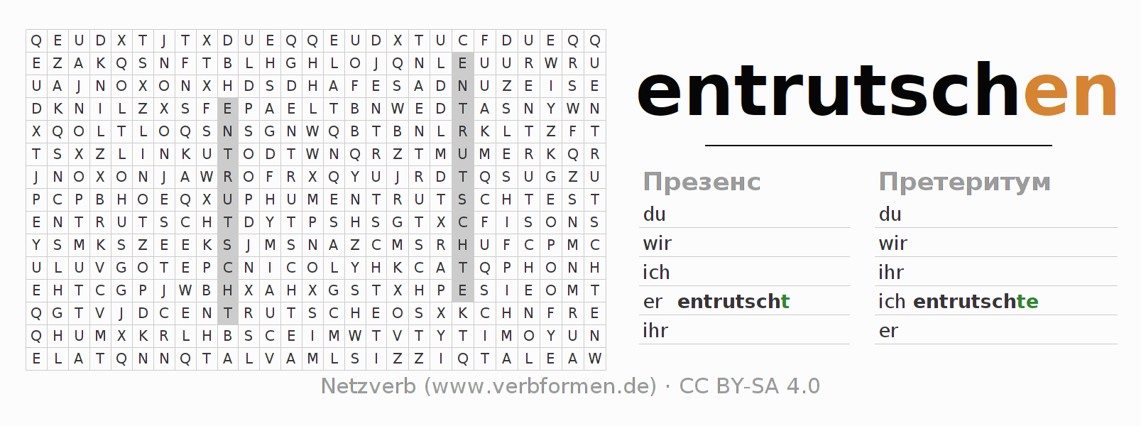 Рабочие материалы служат обучением спряжениям глагола entrutschen на уроке и при самообучении. Рабочие материалы могут быть свободно использованы в рамках лицензии CC BY-SA 4.0 в виде Открытых образовательных ресурсов(ООР) например могут быть бесплатно использованы на уроке. Для этого имеется много различных типов рабочих материалов для глагола entrutschen в наличии. Это таблицы спряжений, головоломки и игры. Весь учебный материал доступен бесплатно как файлы PDF, в виде изображений или как интерактивная версия браузера. В дополнение к задачам, имеются бесчисленные примеры для entrutschen а также помощь в использовании глаголов.