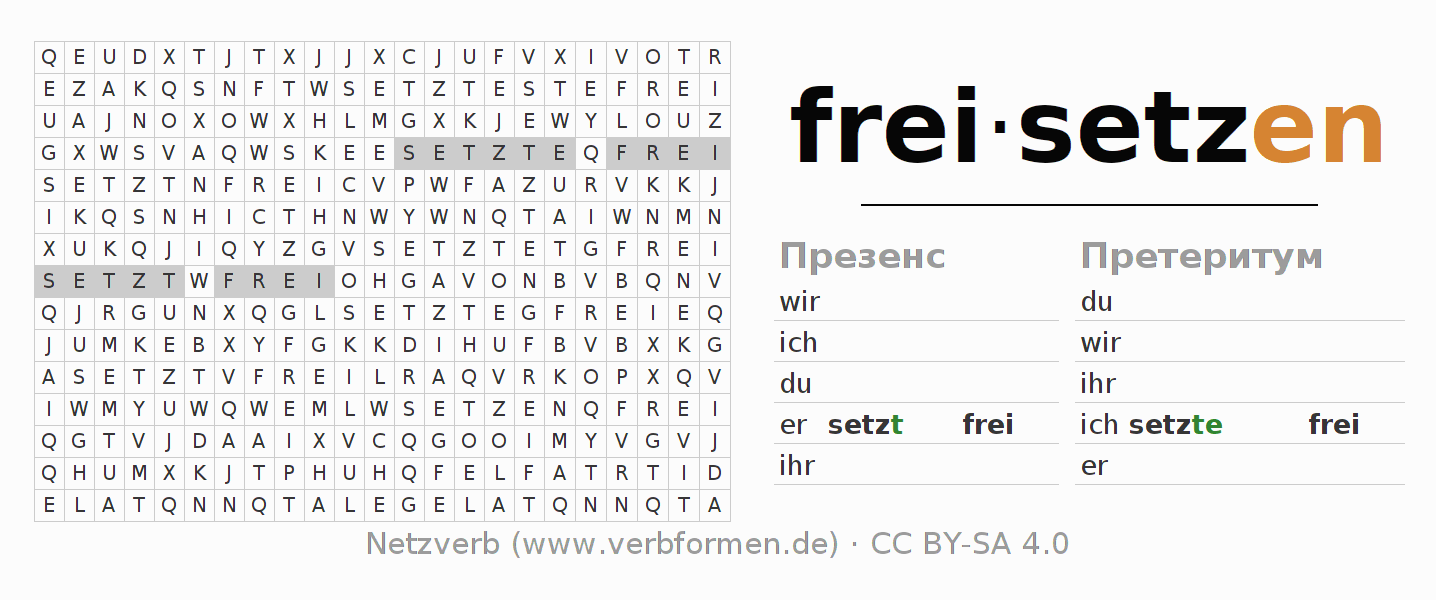 Рабочие материалы служат обучением спряжениям глагола freisetzen на уроке и при самообучении. Рабочие материалы могут быть свободно использованы в рамках лицензии CC BY-SA 4.0 в виде Открытых образовательных ресурсов(ООР) например могут быть бесплатно использованы на уроке. Для этого имеется много различных типов рабочих материалов для глагола freisetzen в наличии. Это таблицы спряжений, головоломки и игры. Весь учебный материал доступен бесплатно как файлы PDF, в виде изображений или как интерактивная версия браузера. В дополнение к задачам, имеются бесчисленные примеры для freisetzen а также помощь в использовании глаголов.