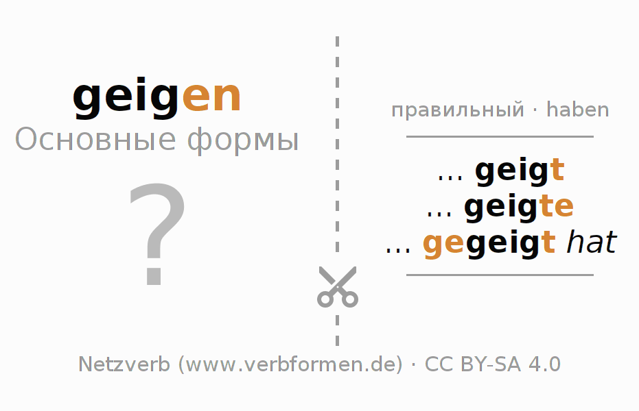Глагольные таблицы, содержащие все формы глагола geigen, для наглядности объединены в одну общую таблицу.