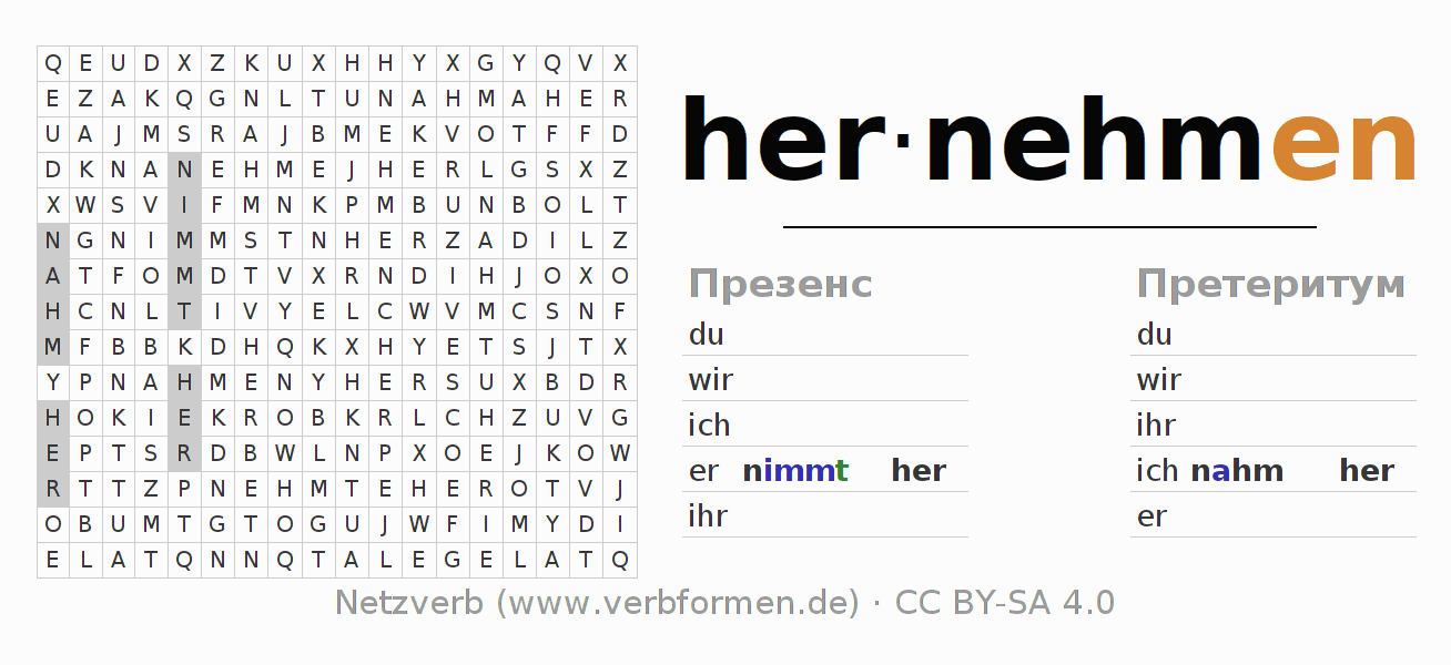 С помощью этих головоломок по поиску слов Вы можете подходящим для Вас способом изучать спряжение немецкого глагола hernehmen.
