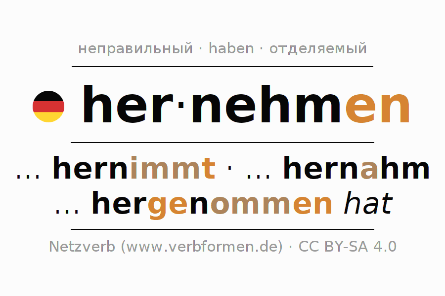 Глагольные таблицы, содержащие все формы глагола hernehmen, для наглядности объединены в одну общую таблицу.