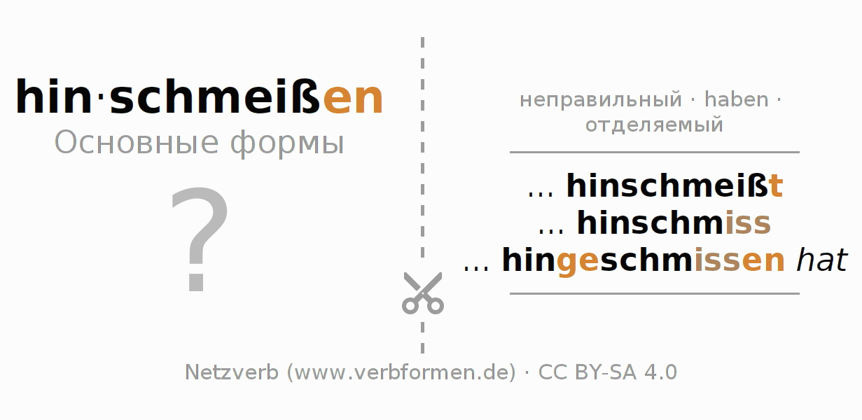 Глагольные таблицы, содержащие все формы глагола hinschmeißen, для наглядности объединены в одну общую таблицу.