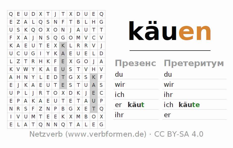 С помощью этих головоломок по поиску слов Вы можете подходящим для Вас способом изучать спряжение немецкого глагола käuen.