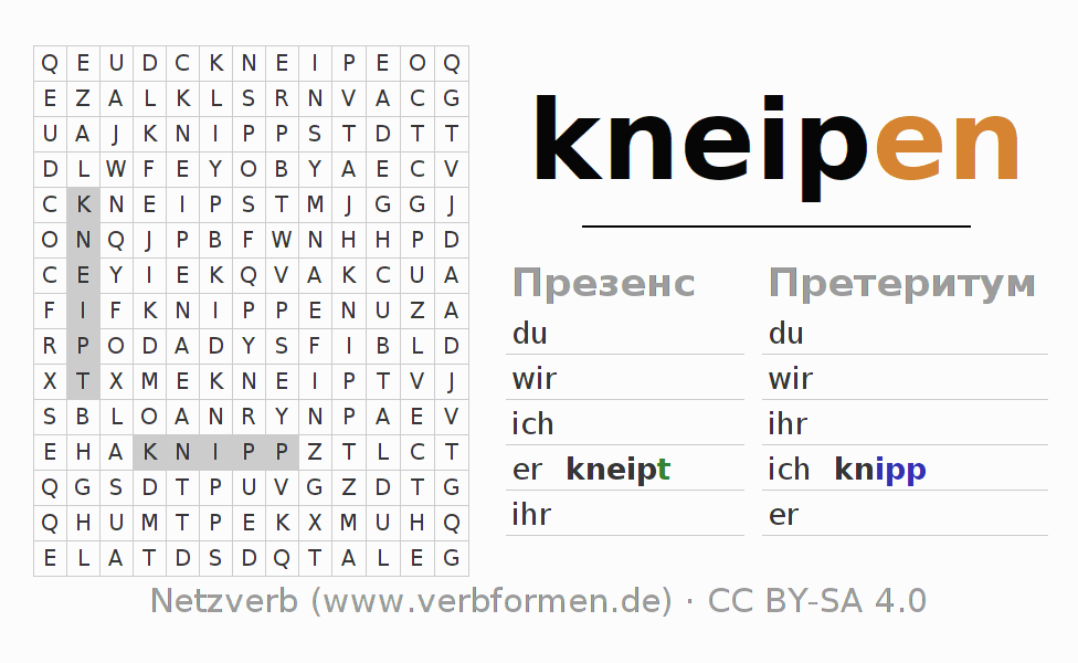 Глагольные таблицы, содержащие все формы глагола kneipen, для наглядности объединены в одну общую таблицу.