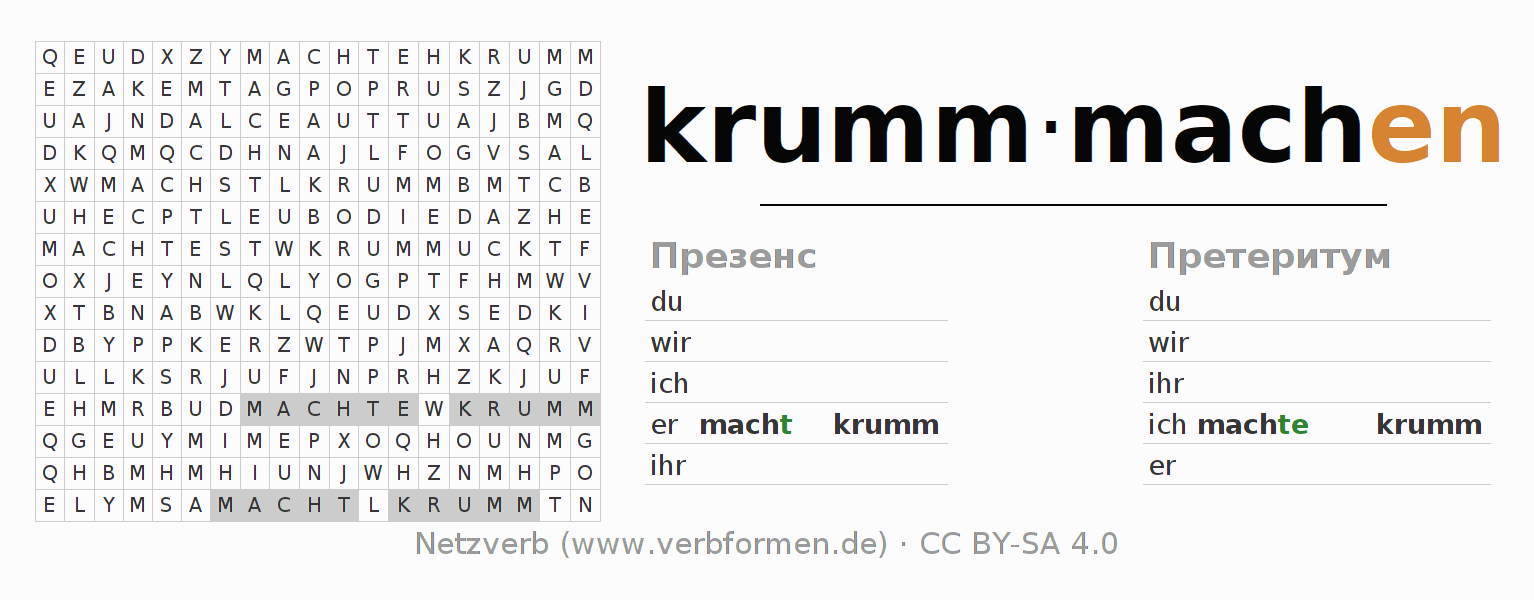 Глагольные таблицы, содержащие все формы глагола krummmachen, для наглядности объединены в одну общую таблицу.
