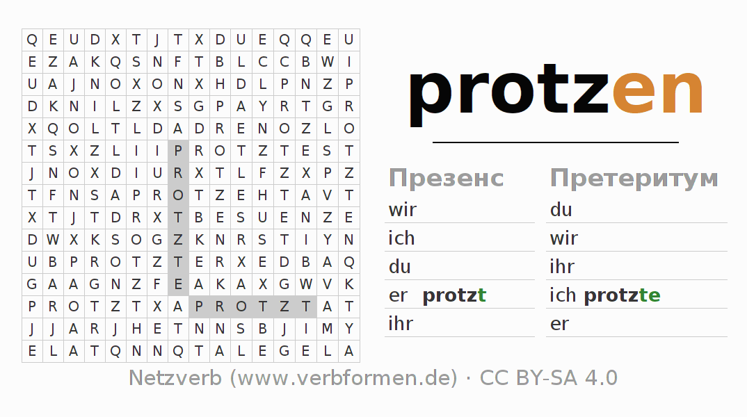 С помощью этих головоломок по поиску слов Вы можете подходящим для Вас способом изучать спряжение немецкого глагола protzen.