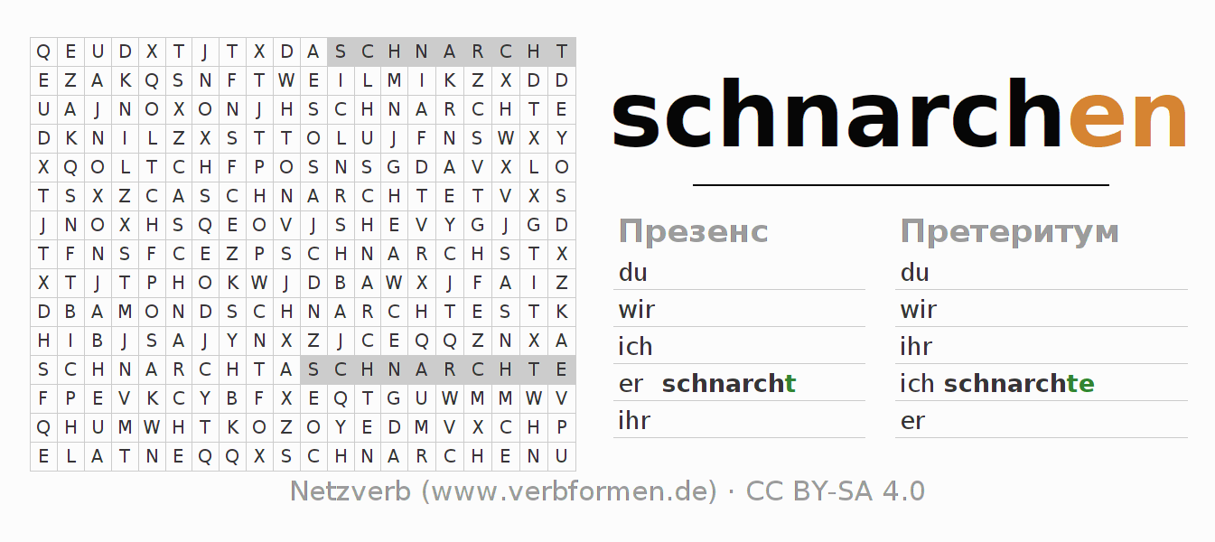 Рабочие материалы служат обучением спряжениям глагола schnarchen на уроке и при самообучении. Рабочие материалы могут быть свободно использованы в рамках лицензии CC BY-SA 4.0 в виде Открытых образовательных ресурсов(ООР) например могут быть бесплатно использованы на уроке. Для этого имеется много различных типов рабочих материалов для глагола schnarchen в наличии. Это таблицы спряжений, головоломки и игры. Весь учебный материал доступен бесплатно как файлы PDF, в виде изображений или как интерактивная версия браузера. В дополнение к задачам, имеются бесчисленные примеры для schnarchen а также помощь в использовании глаголов.