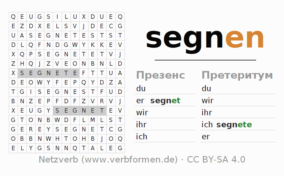 С помощью этих головоломок по поиску слов Вы можете подходящим для Вас способом изучать спряжение немецкого глагола segnen.