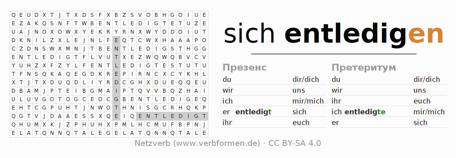 Рабочие материалы служат обучением спряжениям глагола entledigen на уроке и при самообучении. Рабочие материалы могут быть свободно использованы в рамках лицензии CC BY-SA 4.0 в виде Открытых образовательных ресурсов(ООР) например могут быть бесплатно использованы на уроке. Для этого имеется много различных типов рабочих материалов для глагола sich entledigen в наличии. Это таблицы спряжений, головоломки и игры. Весь учебный материал доступен бесплатно как файлы PDF, в виде изображений или как интерактивная версия браузера. В дополнение к задачам, имеются бесчисленные примеры для entledigen а также помощь в использовании глаголов.