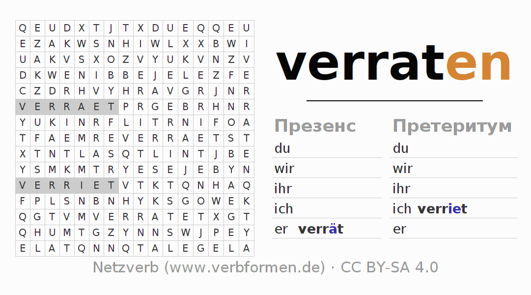 Глагольные таблицы, содержащие все формы глагола verraten, для наглядности объединены в одну общую таблицу.