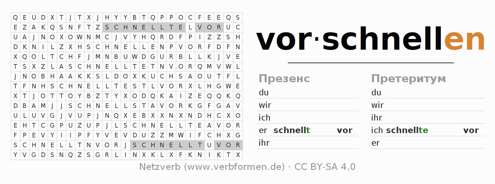 С помощью этих головоломок по поиску слов Вы можете подходящим для Вас способом изучать спряжение немецкого глагола vorschnellen.