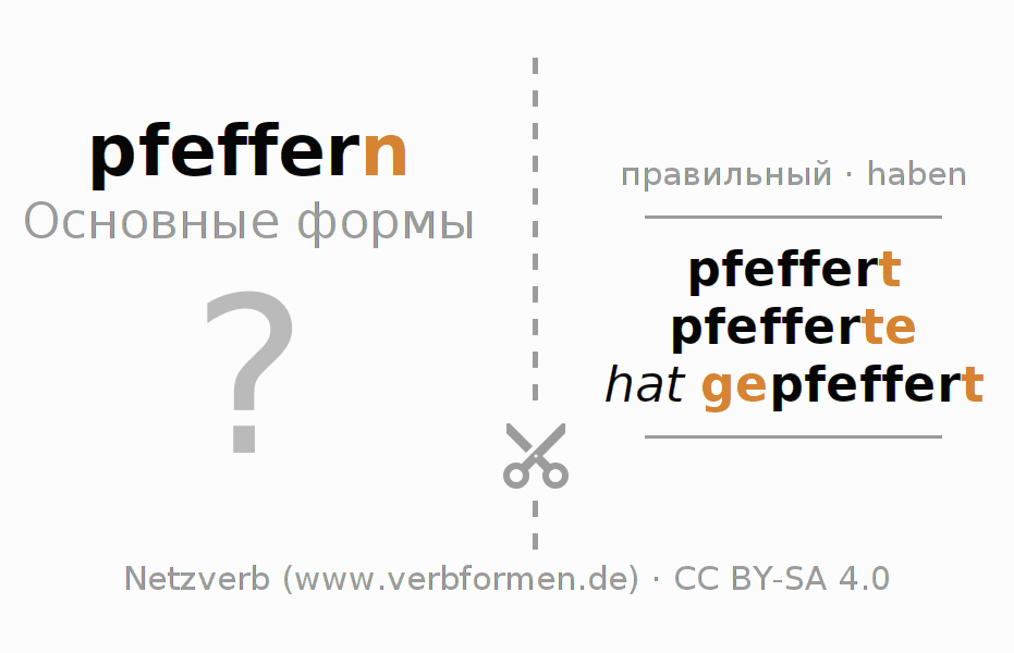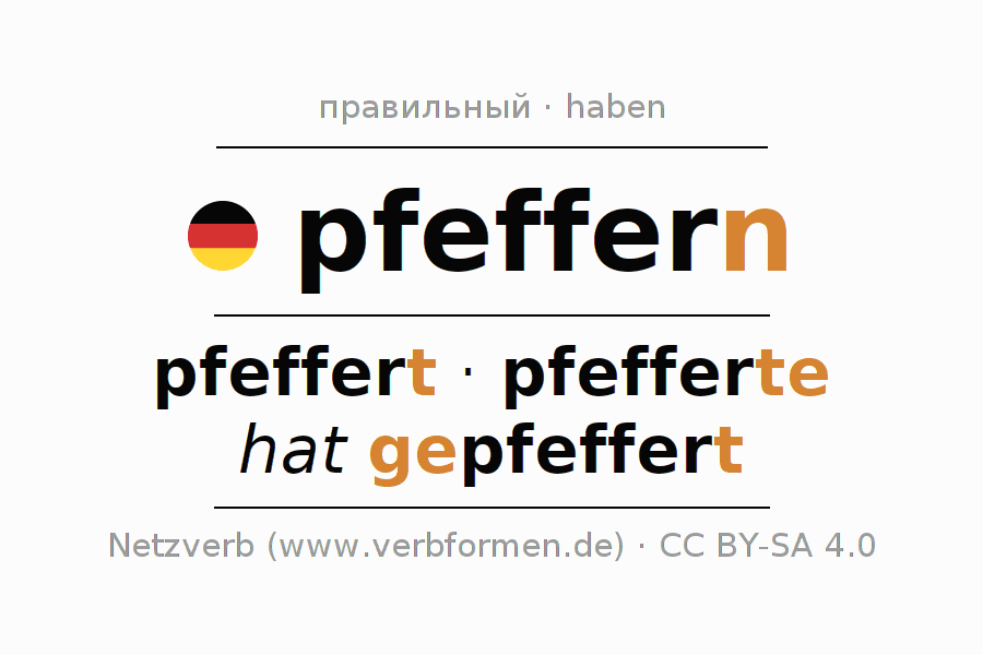 Глагольные таблицы, содержащие все формы глагола pfeffern, для наглядности объединены в одну общую таблицу.